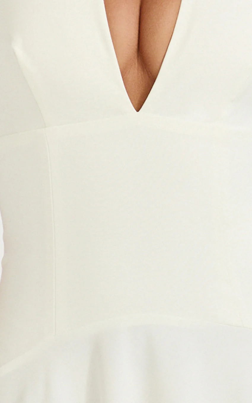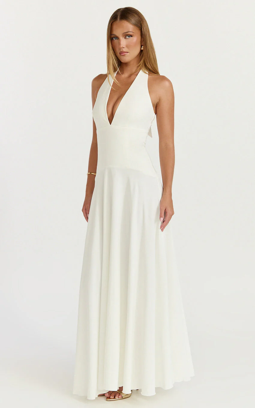 Poppy Maxi Dress - Contrast Skirt Deep Plunge Halter Dress in Off White