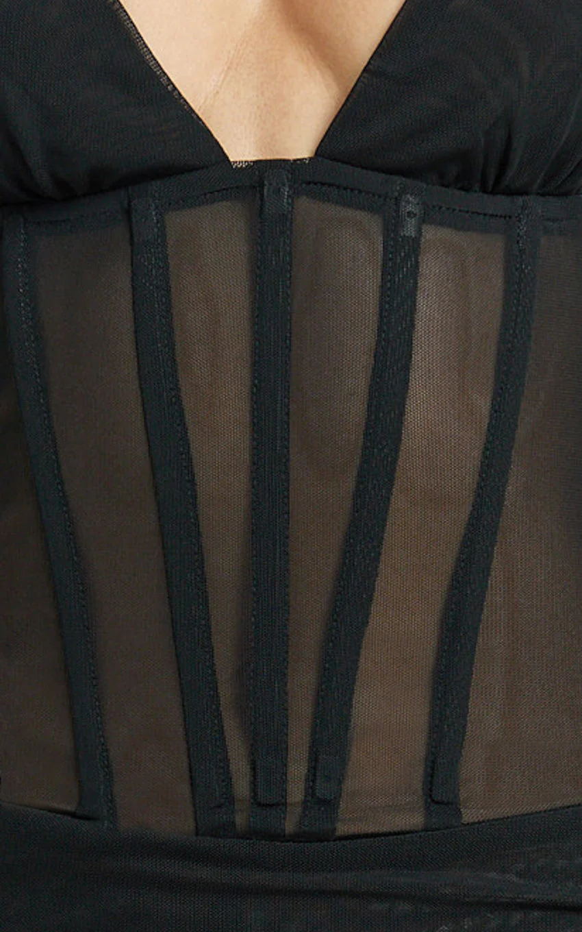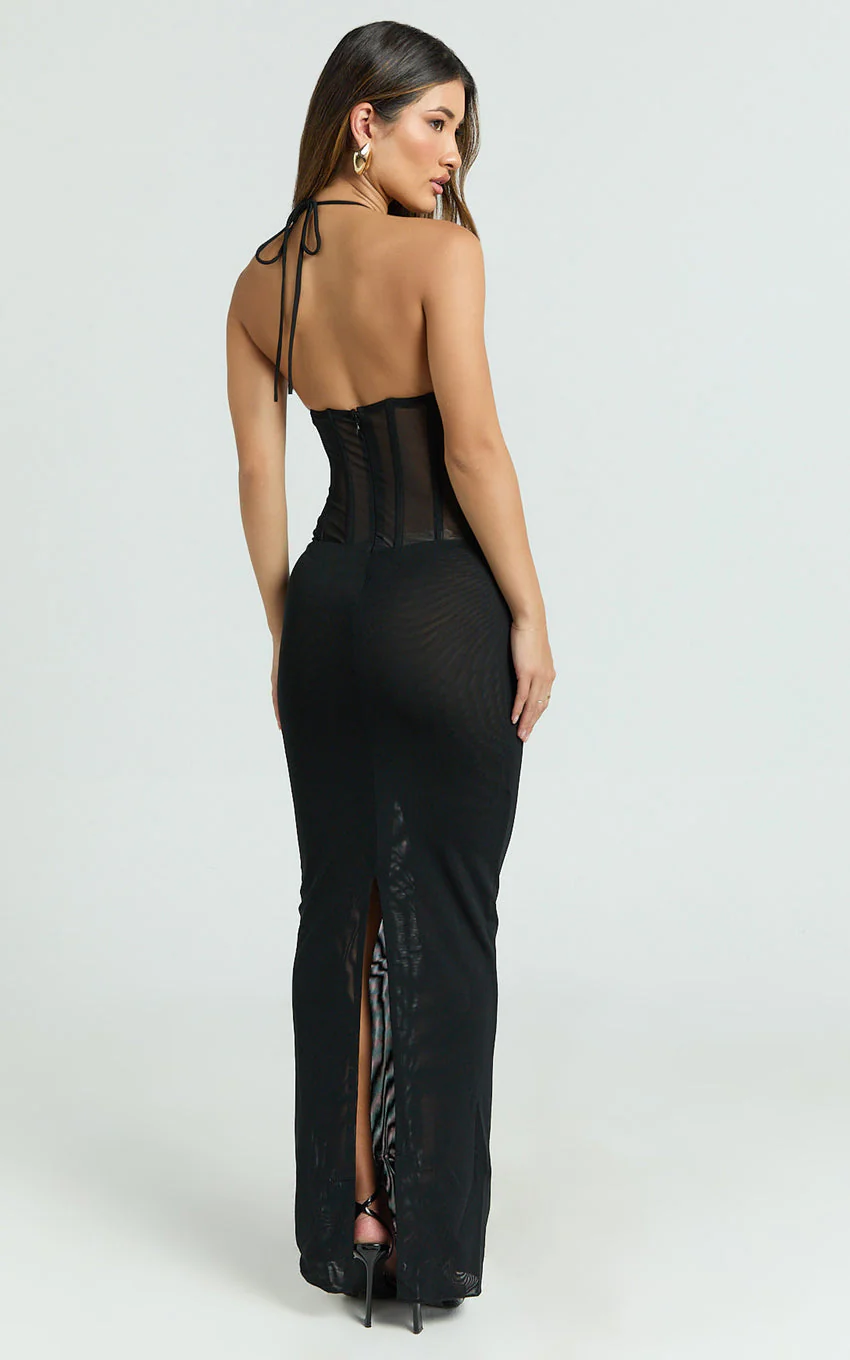 Roselyn Maxi Dress - Halter Neck Corset Waist Column Dress in Black