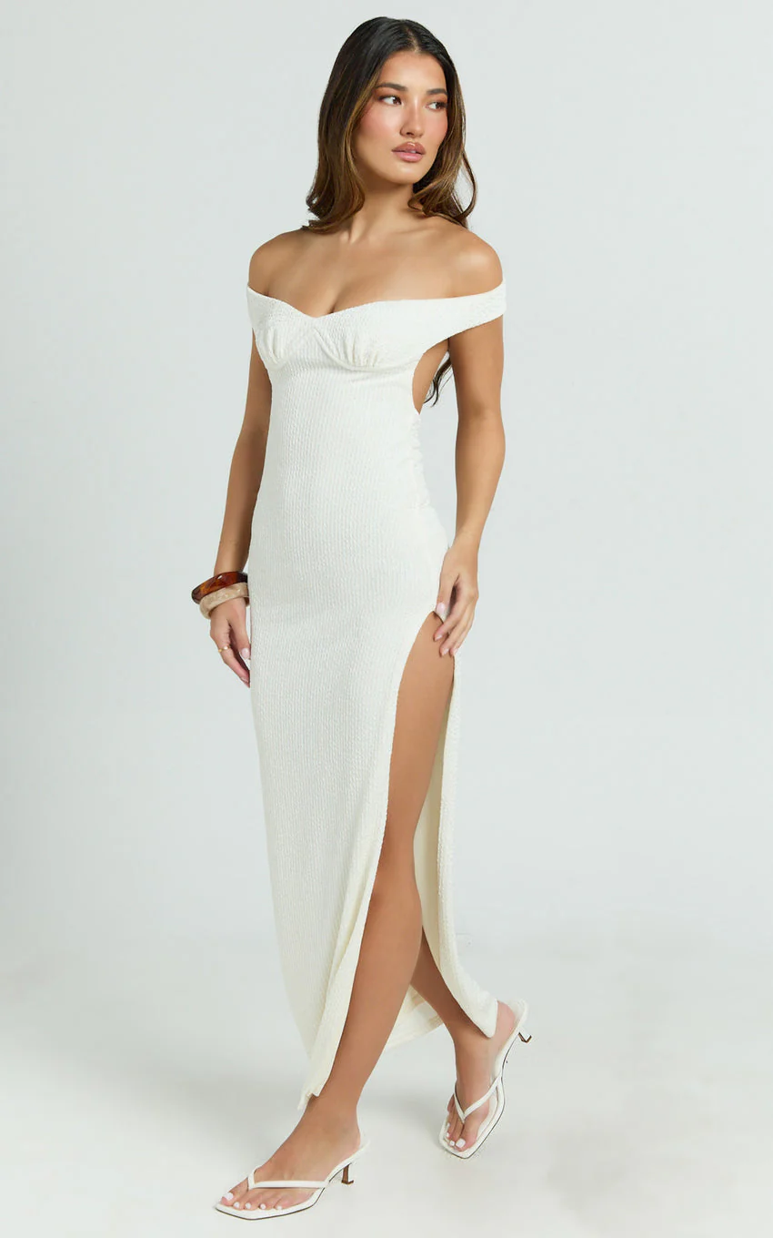 Anziel Maxi Dress - Underwire Off Shoulder Backless Column Jersey Tie Back in Off White