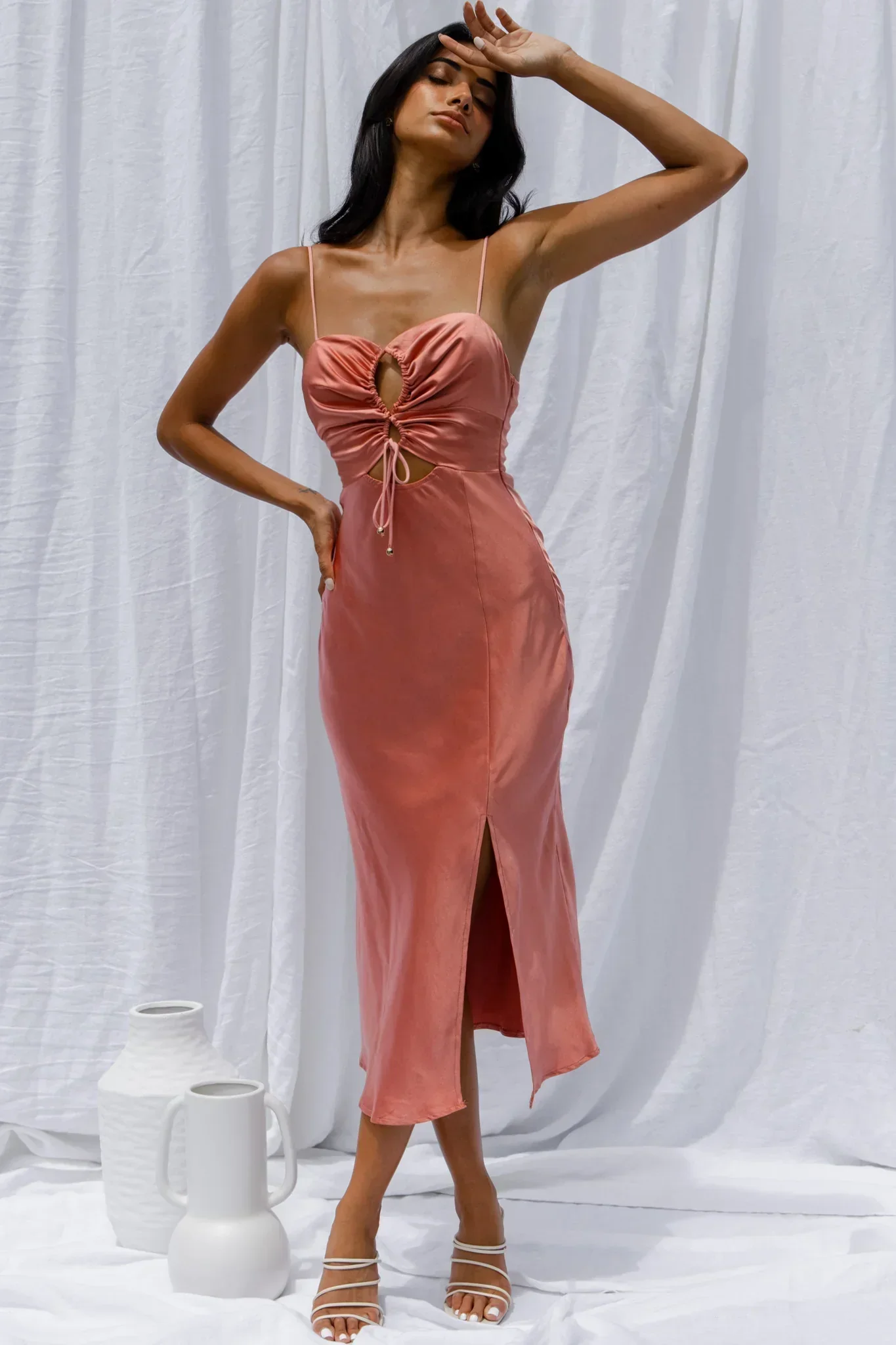 Date Night Drawstring Bust Midi Dress Rose