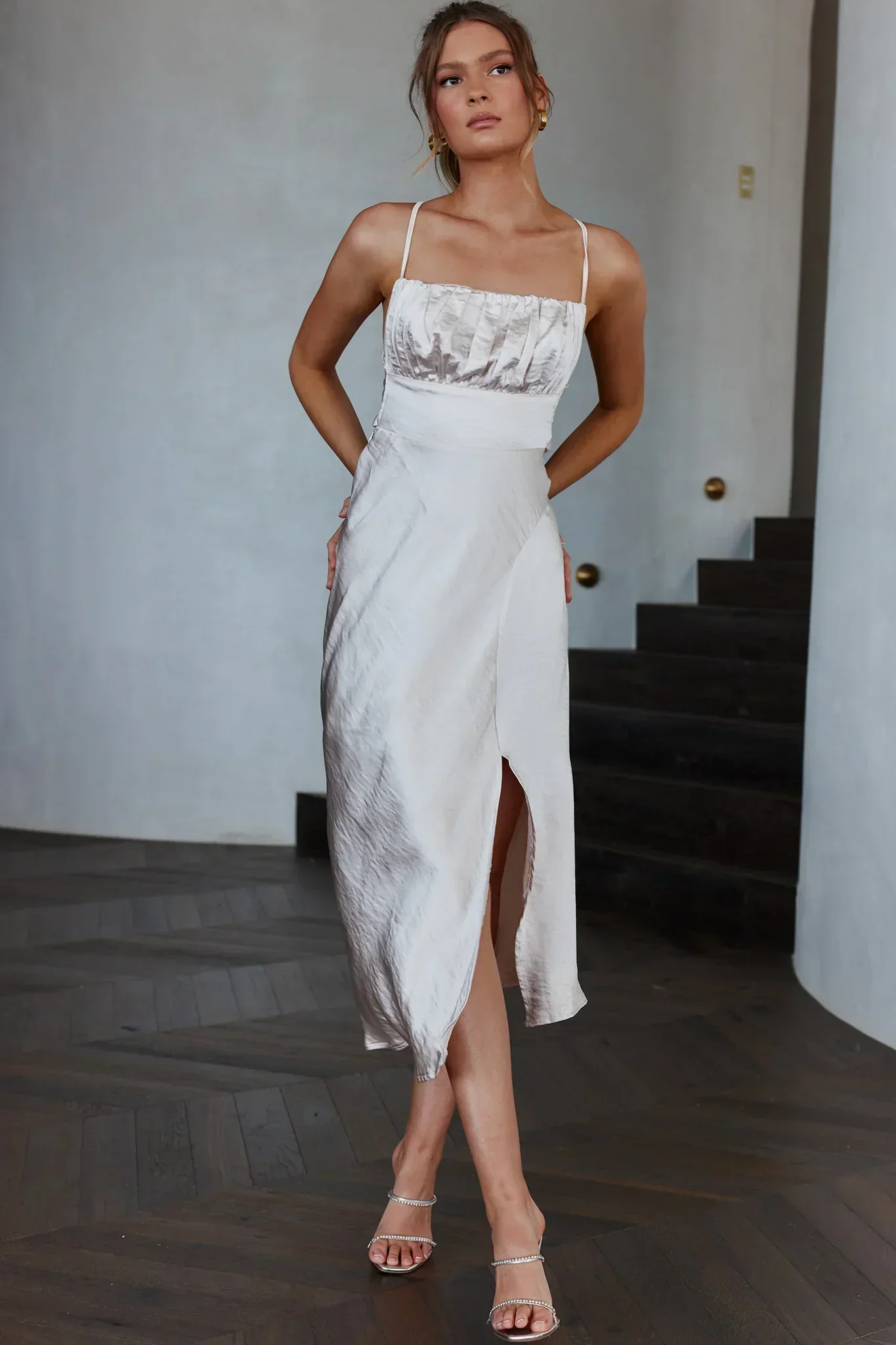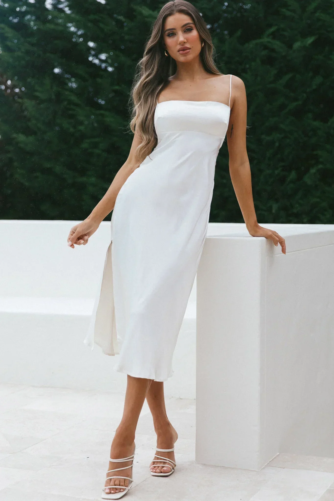 Abby Cami Strap Gathered Bust Front Split Midi Dress White