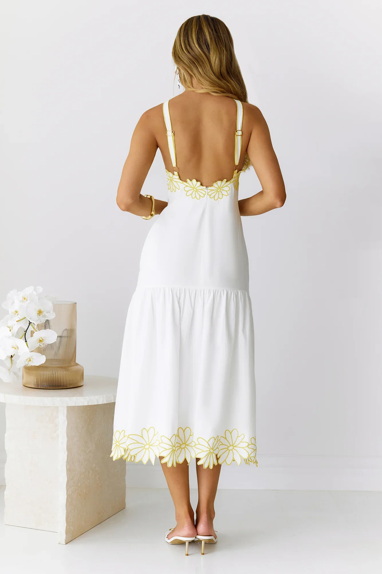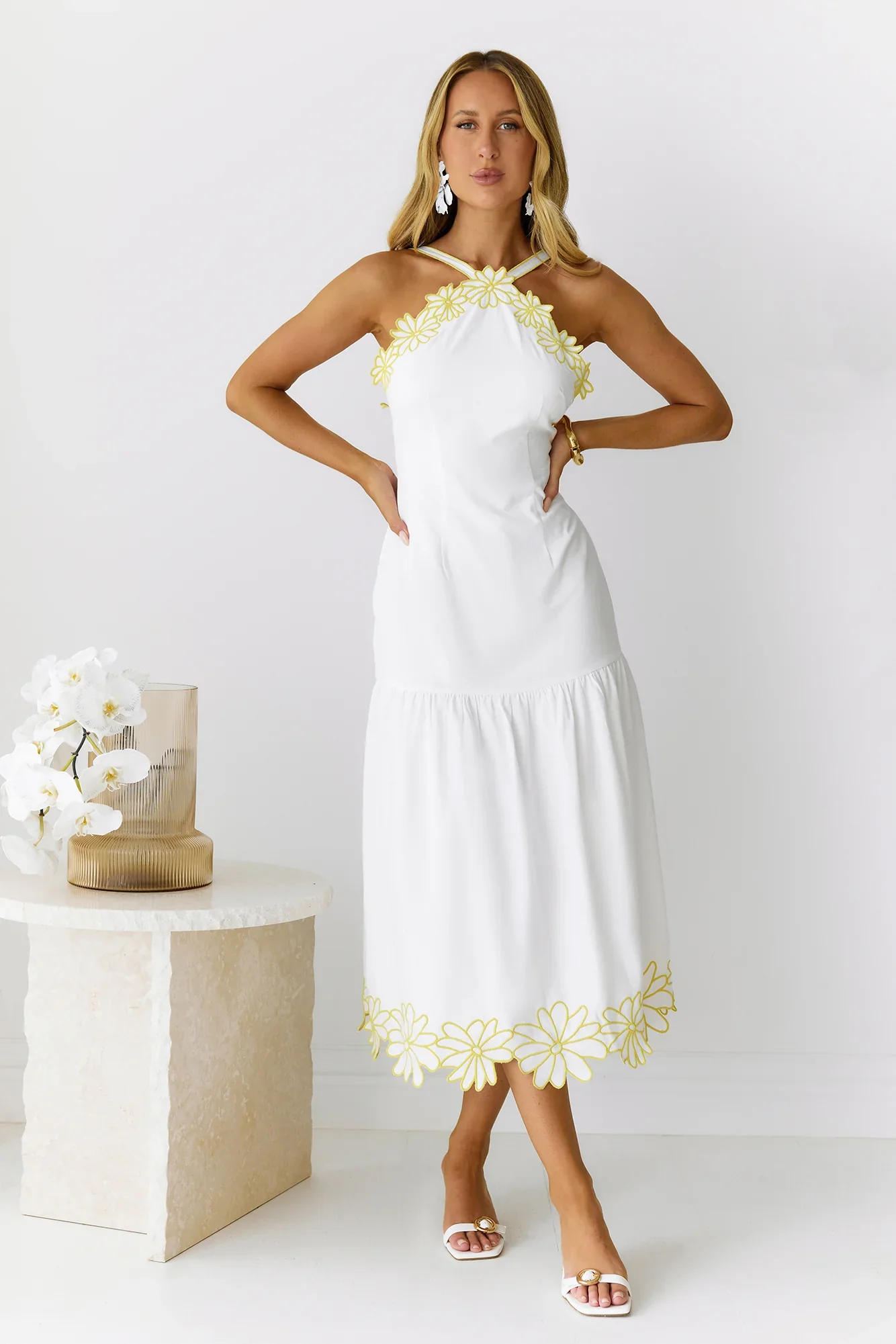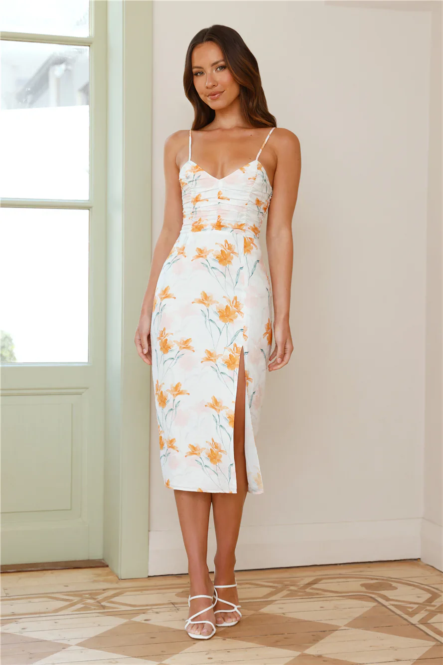 Golden Petals Midi Dress White