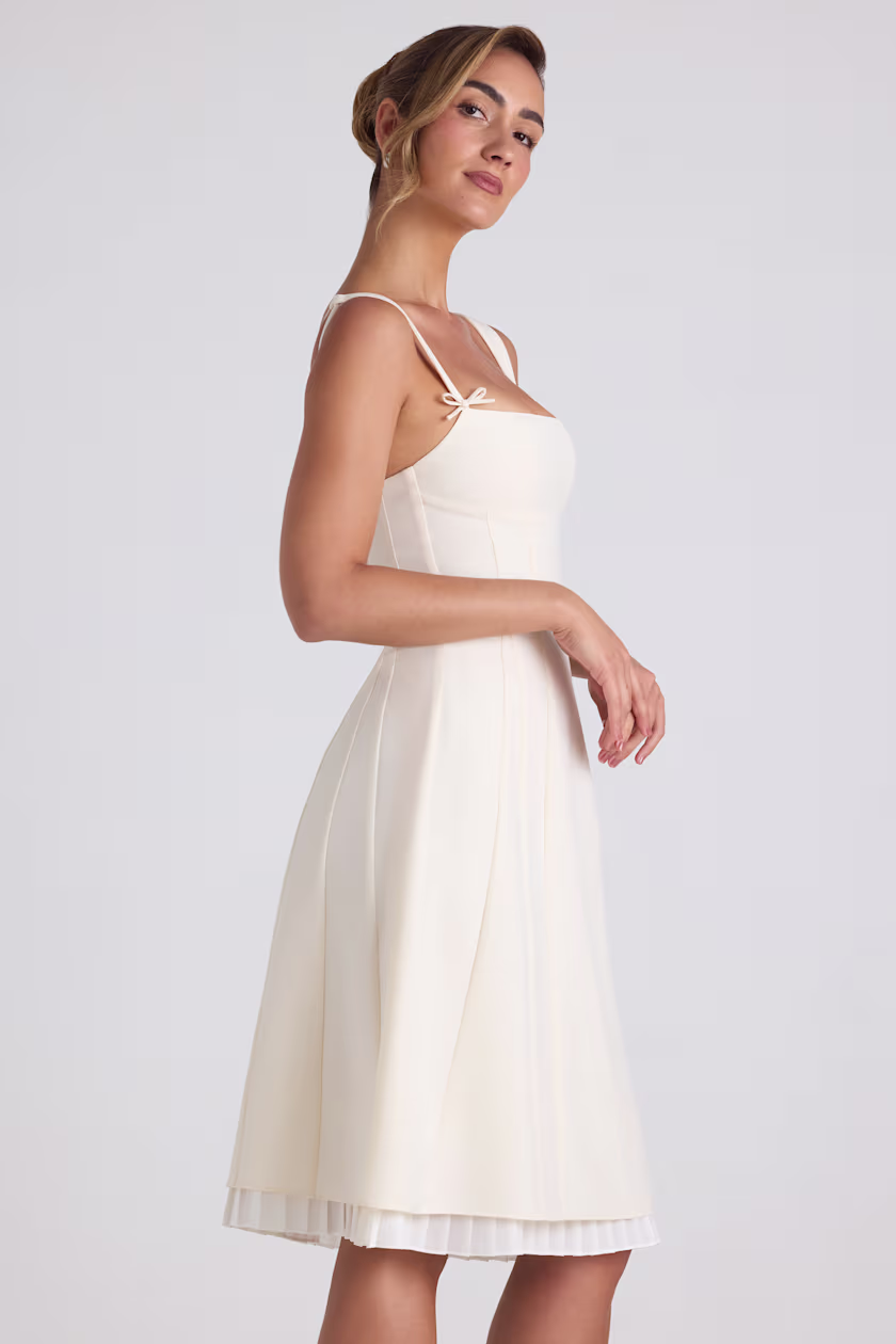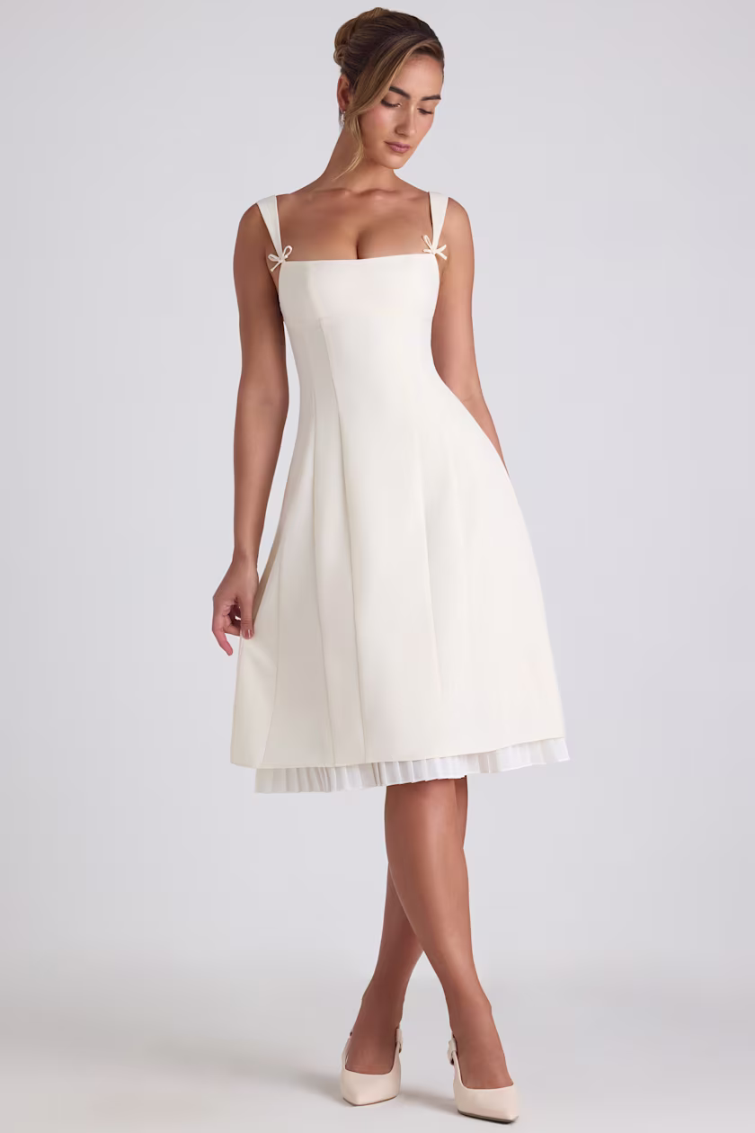 Bow-Detail Pleated A-Line Midi Dress in Ivory
