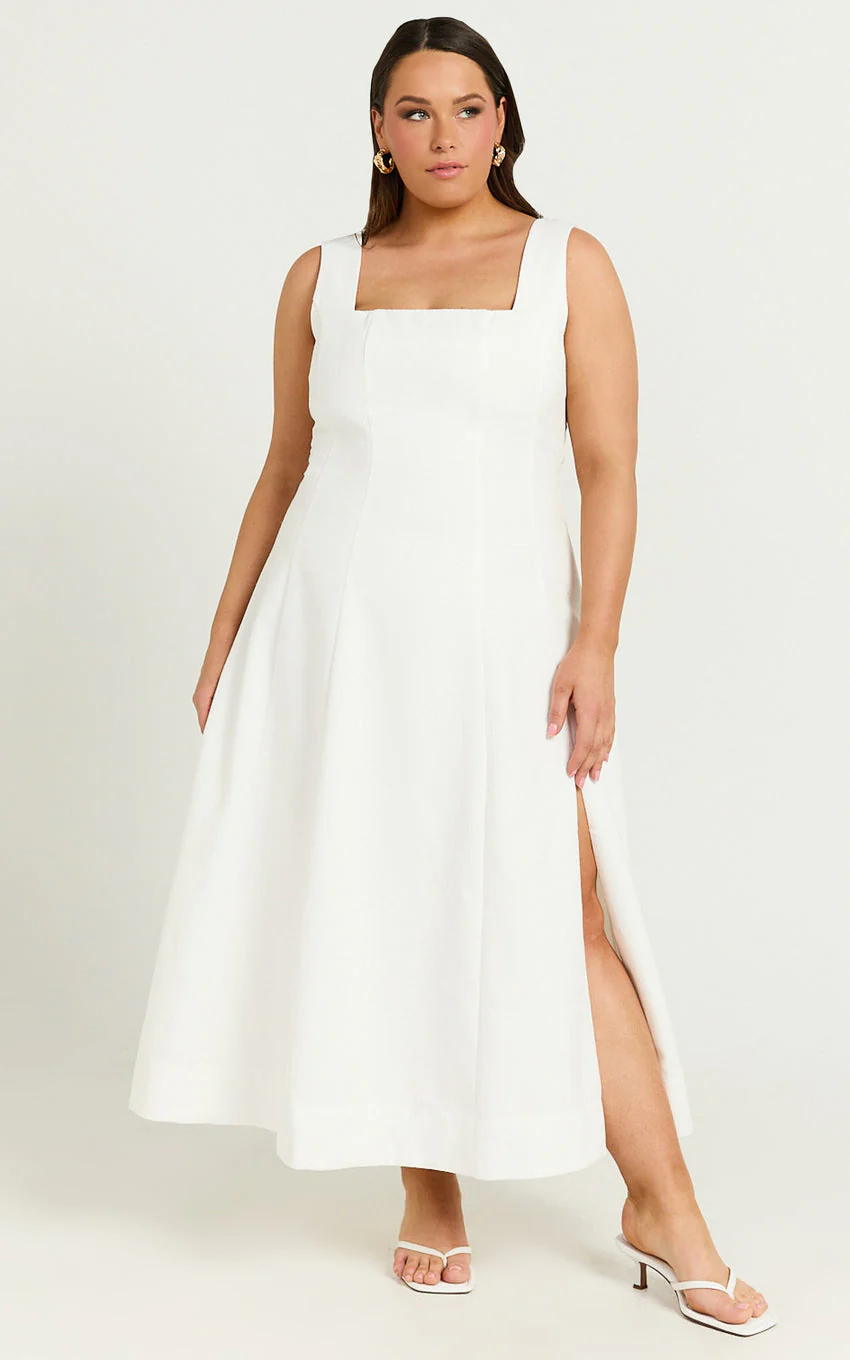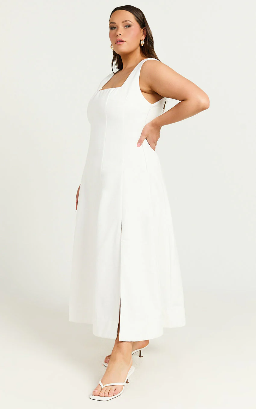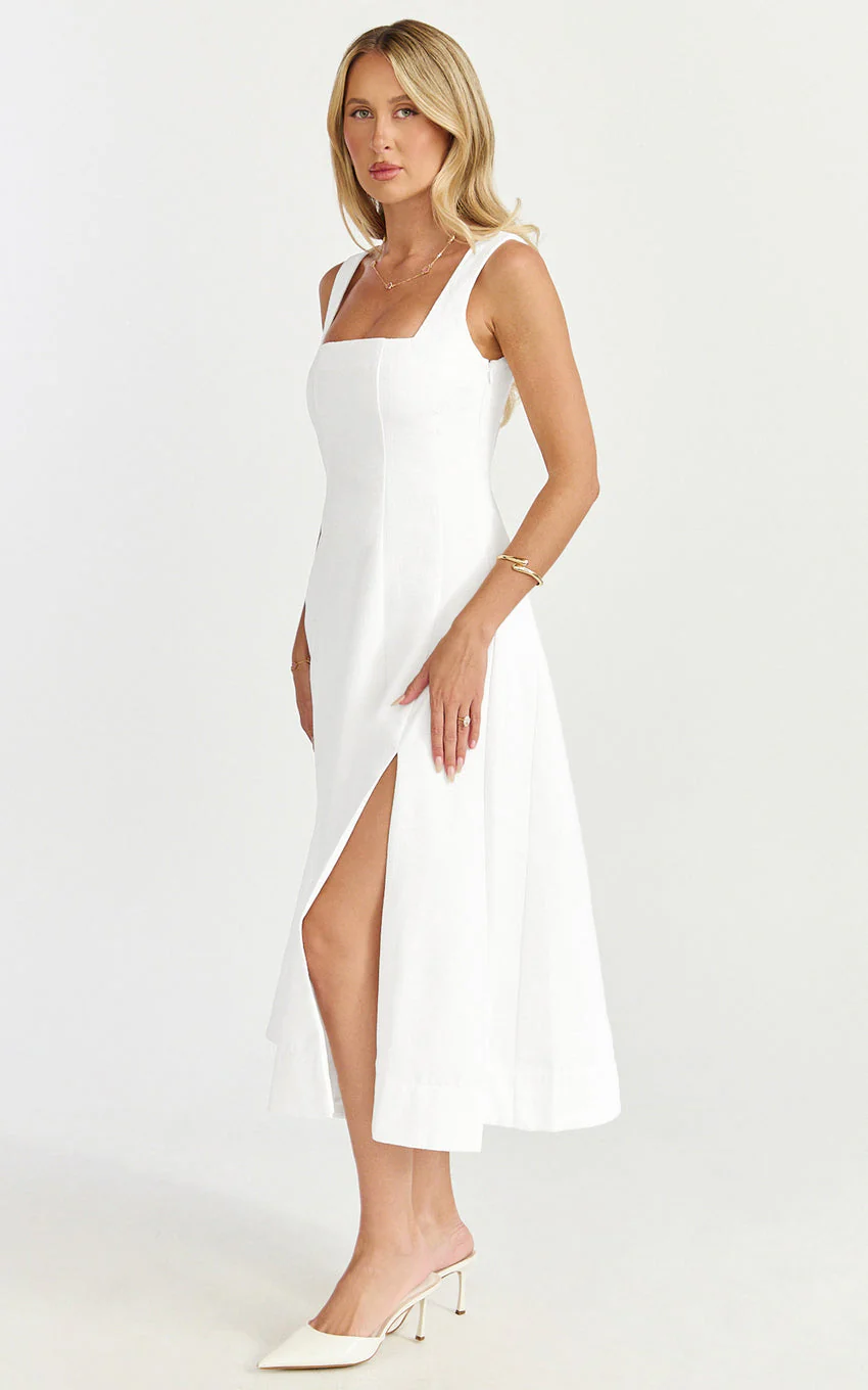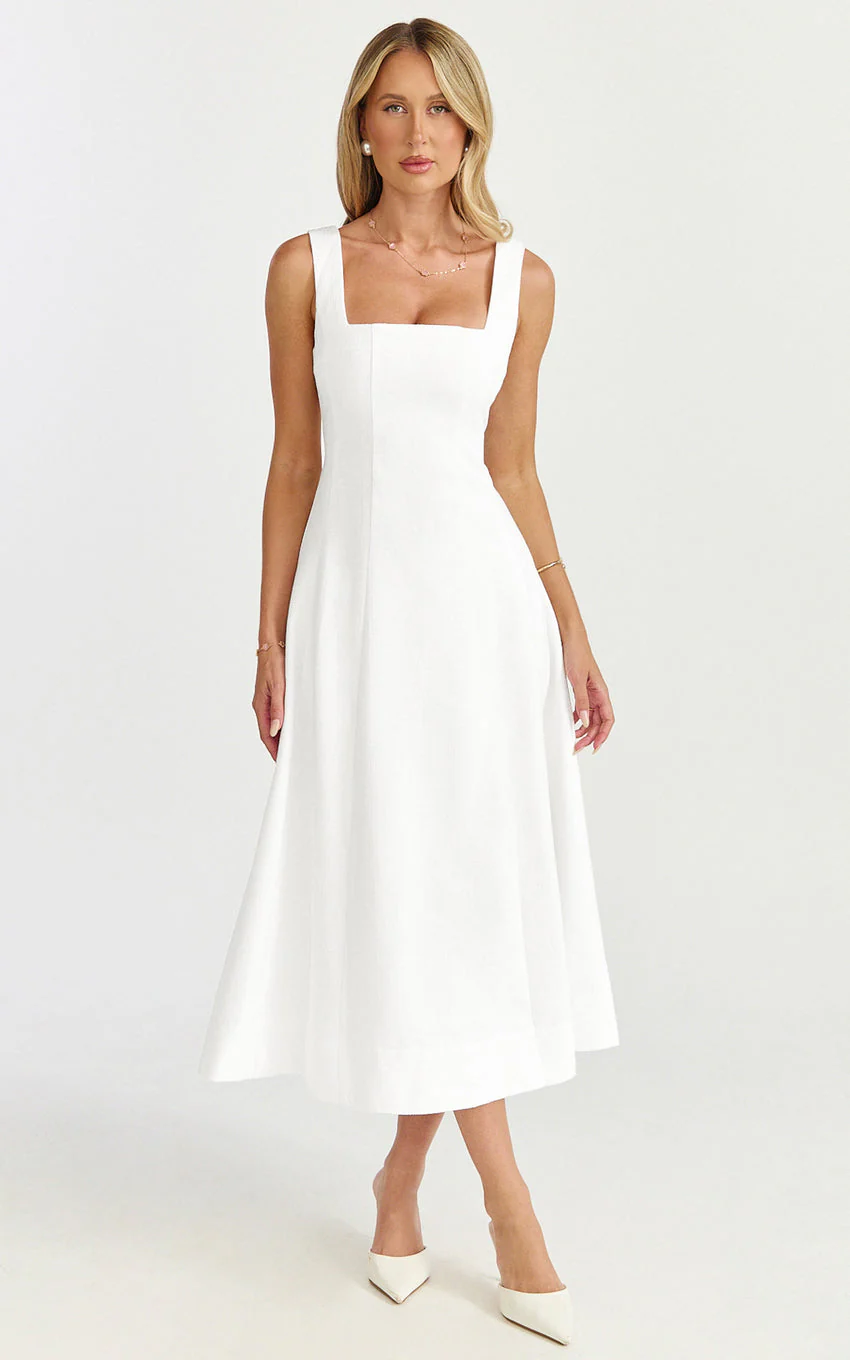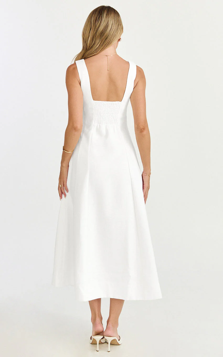 Walters Midi Dress - Square Neck Shirred Back Fit and Flare Panel Dress in White