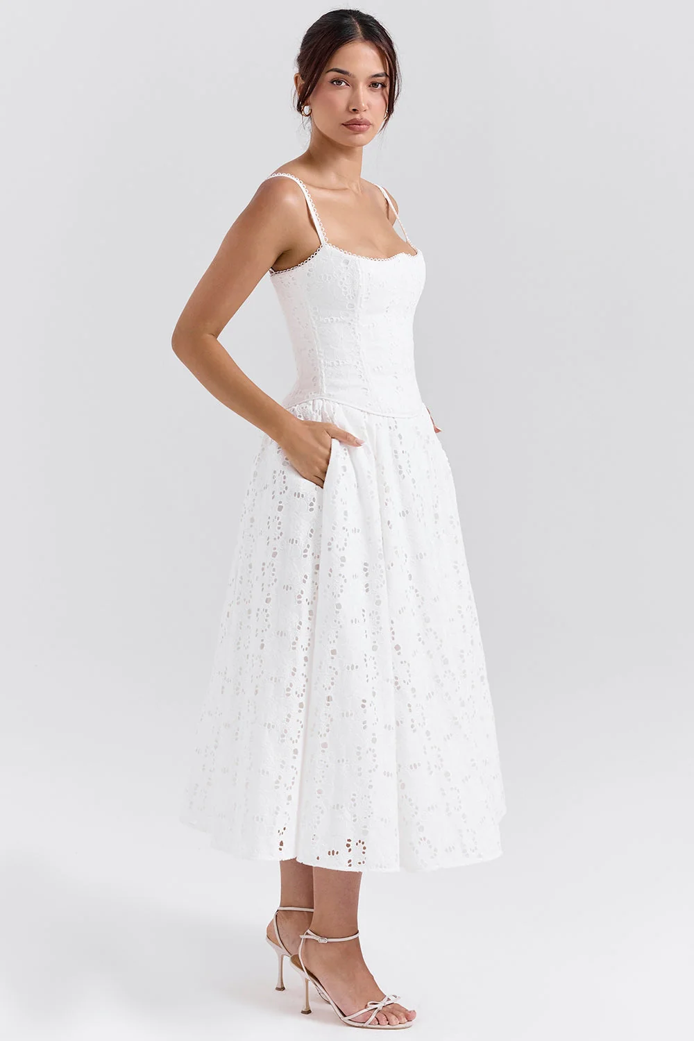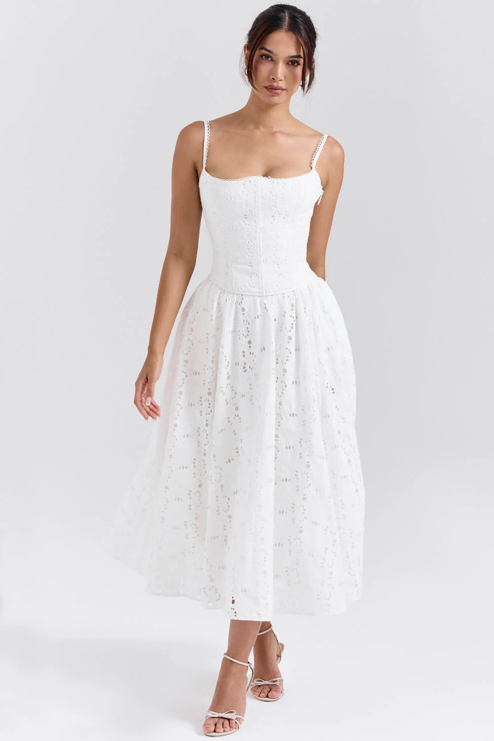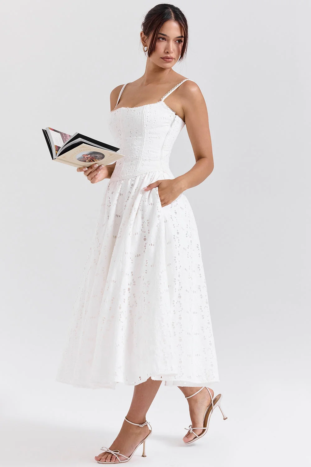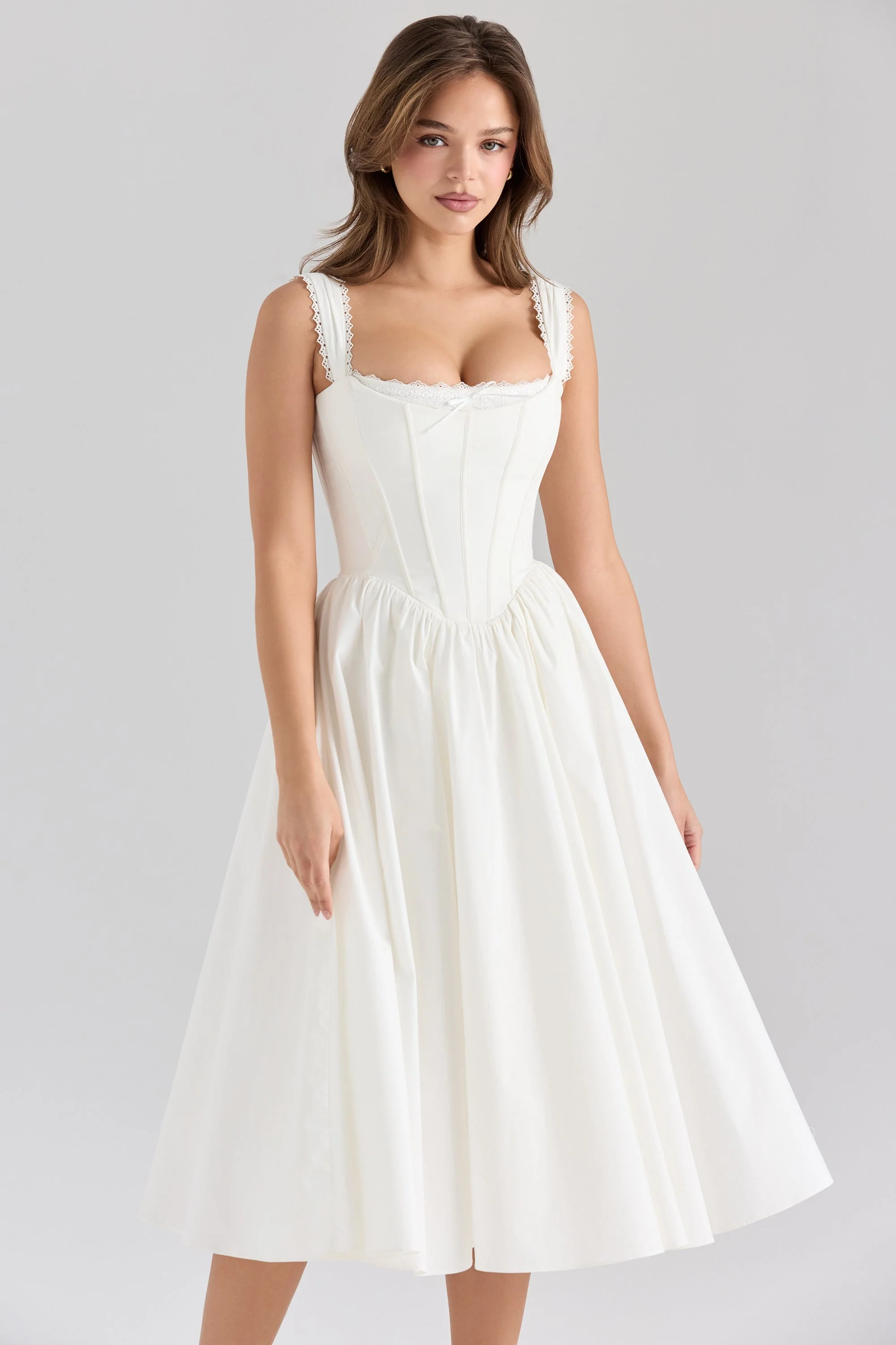Walters Midi Dress - Square Neck Shirred Back Fit and Flare Panel Dress in White