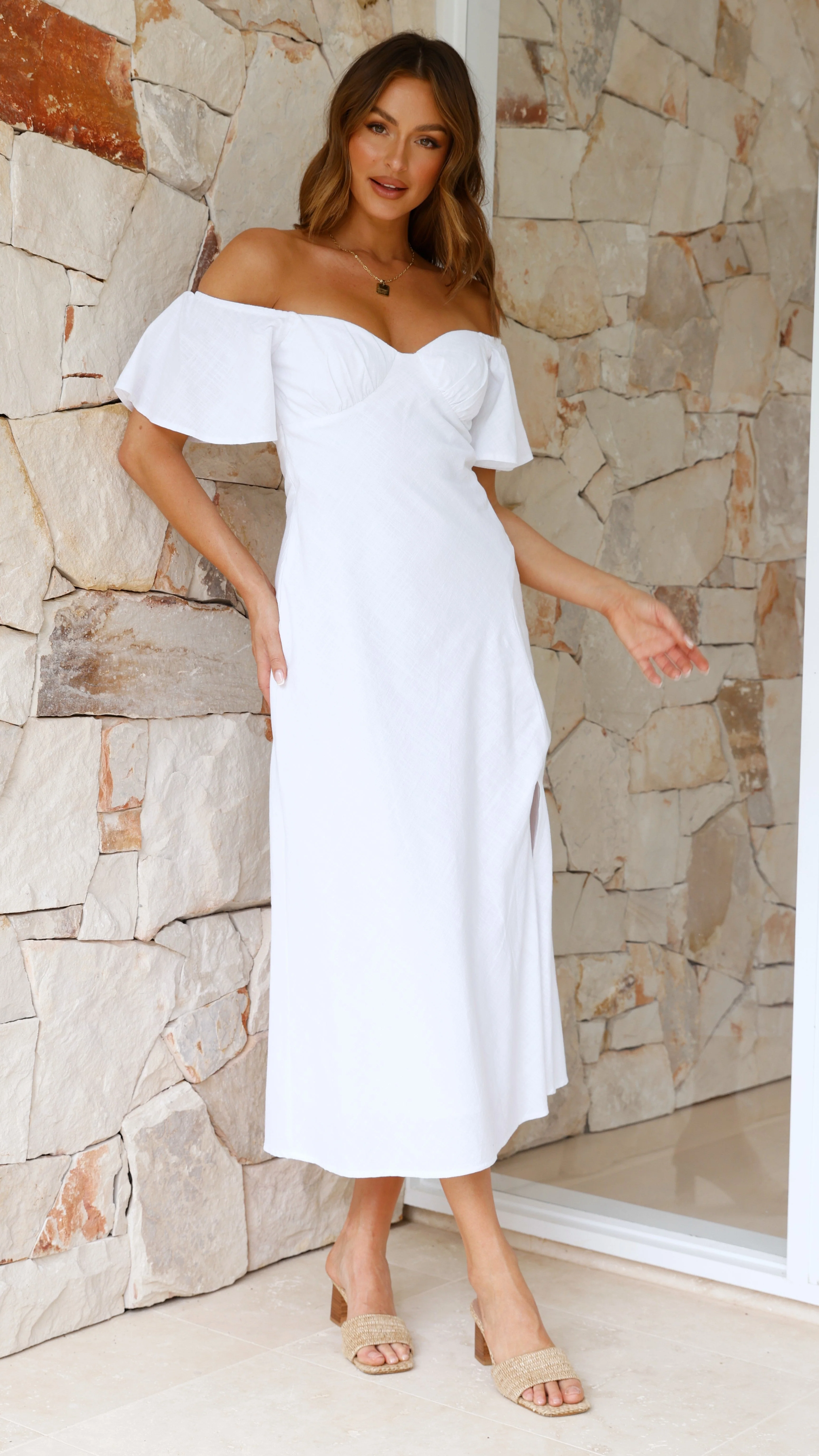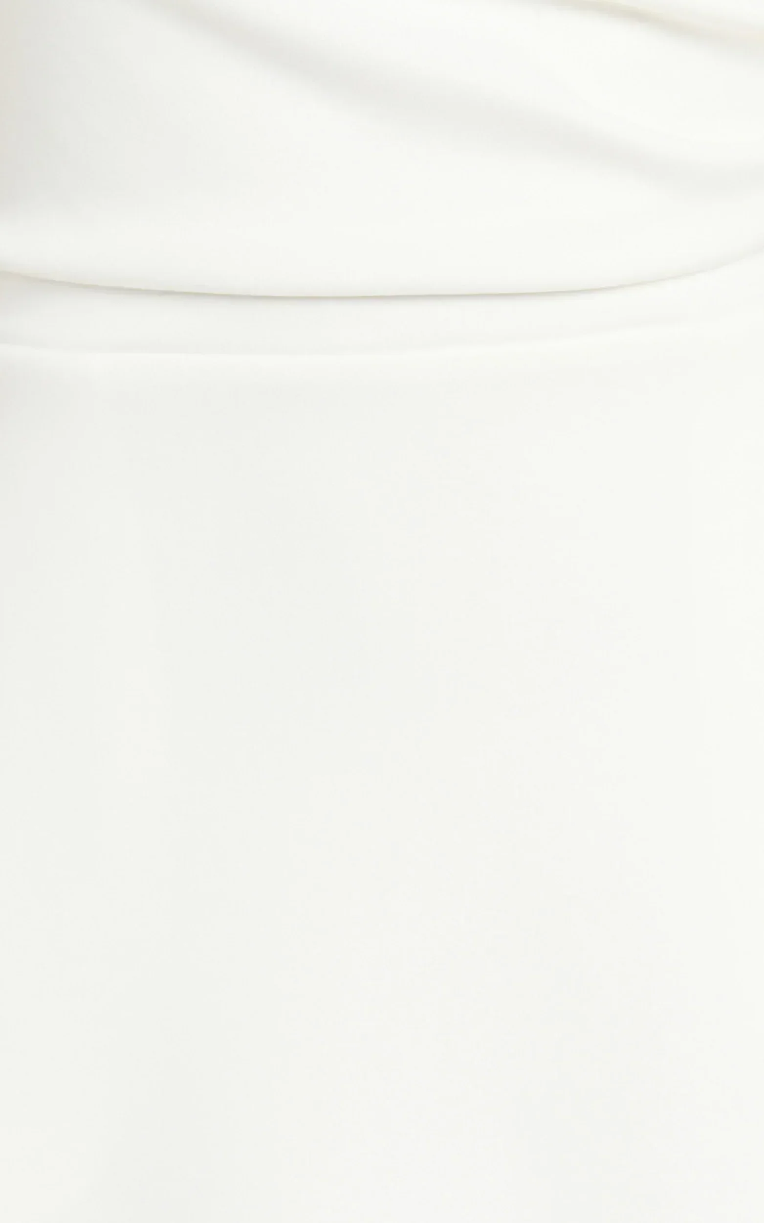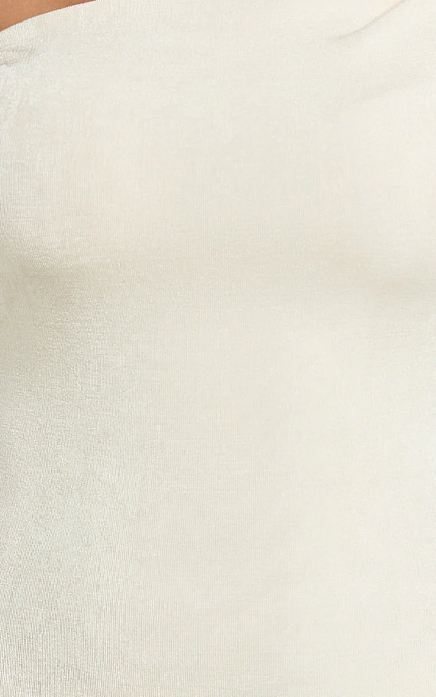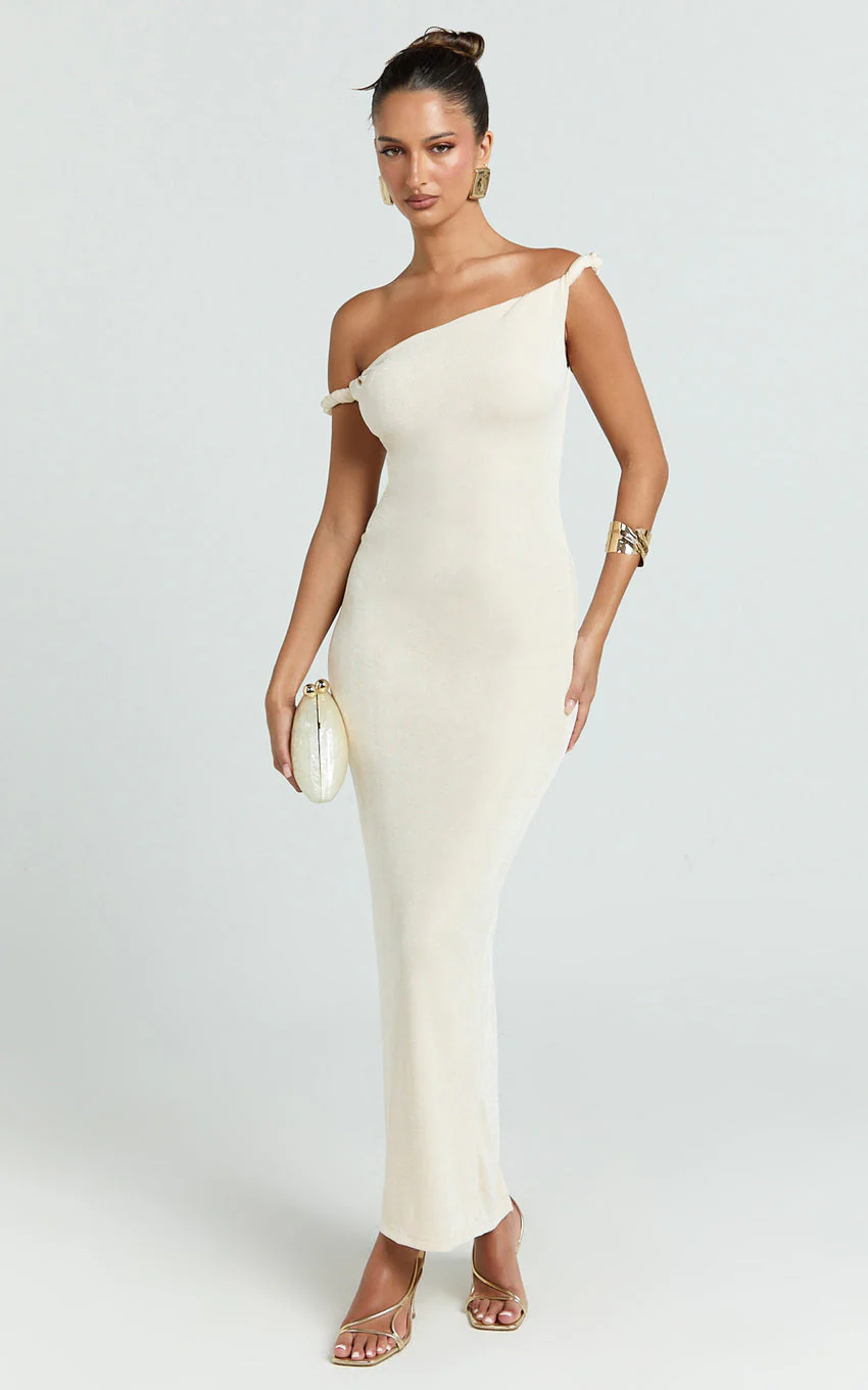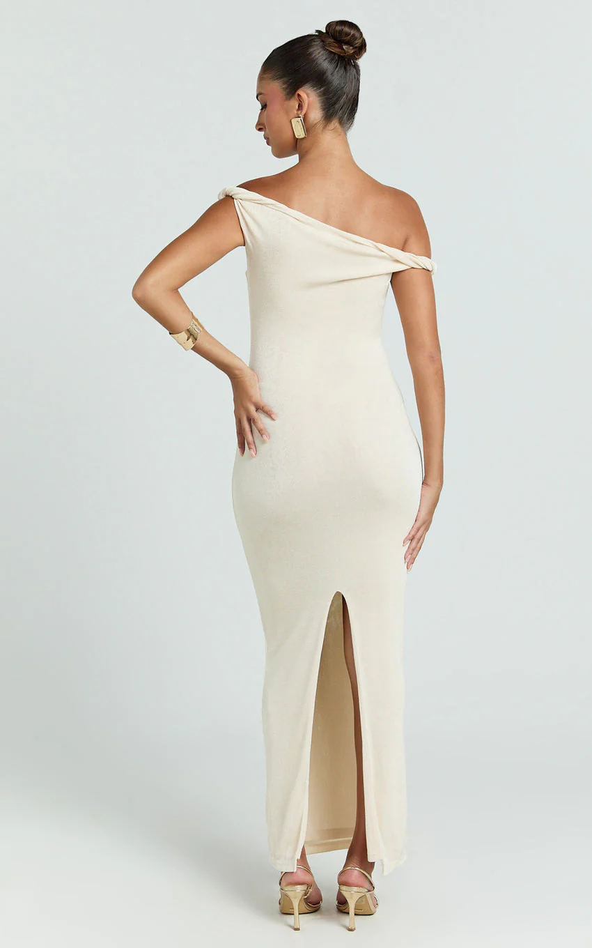 Isabel Midi Dress - Twist Off Shoulder Bodycon Dress in Cream