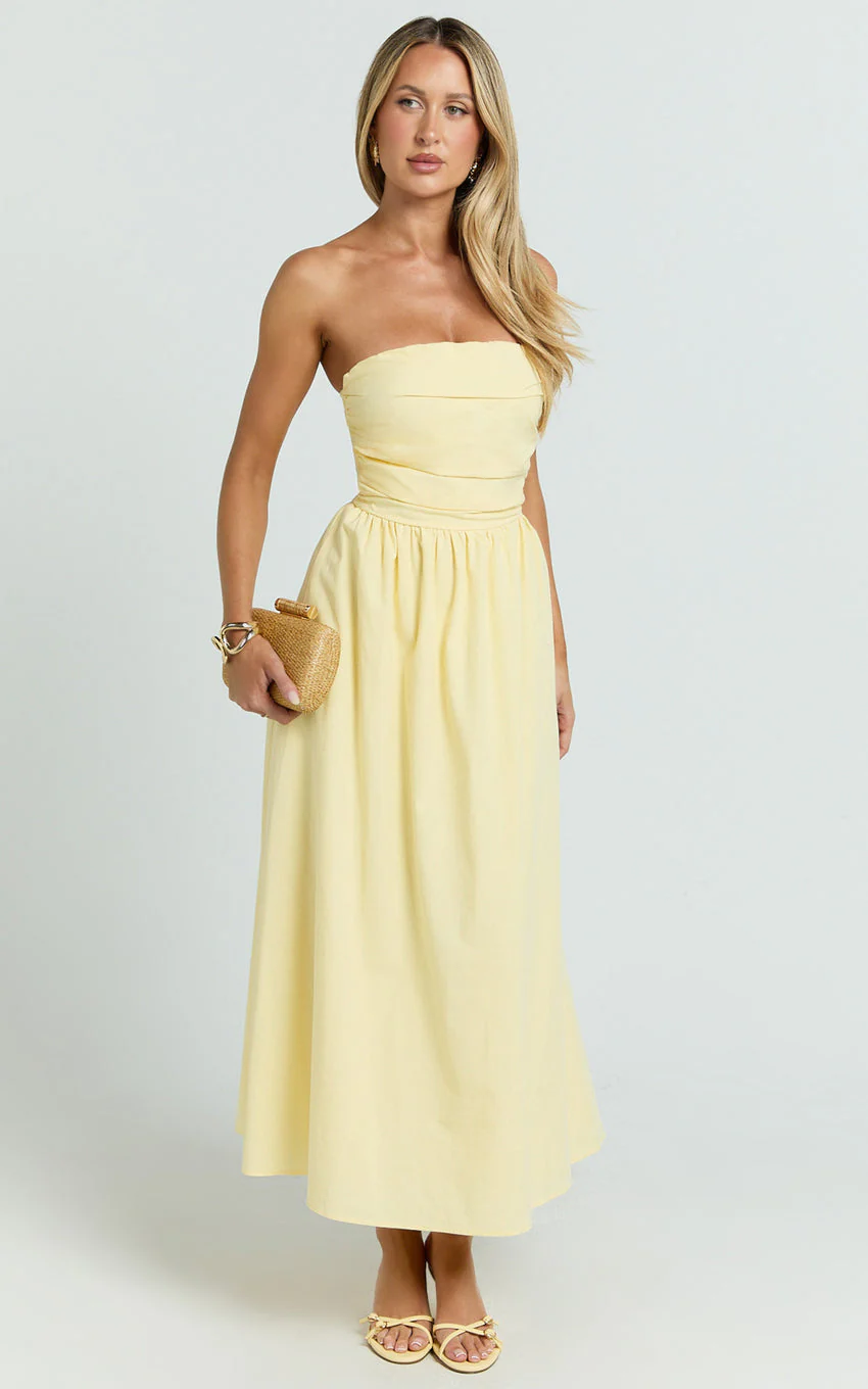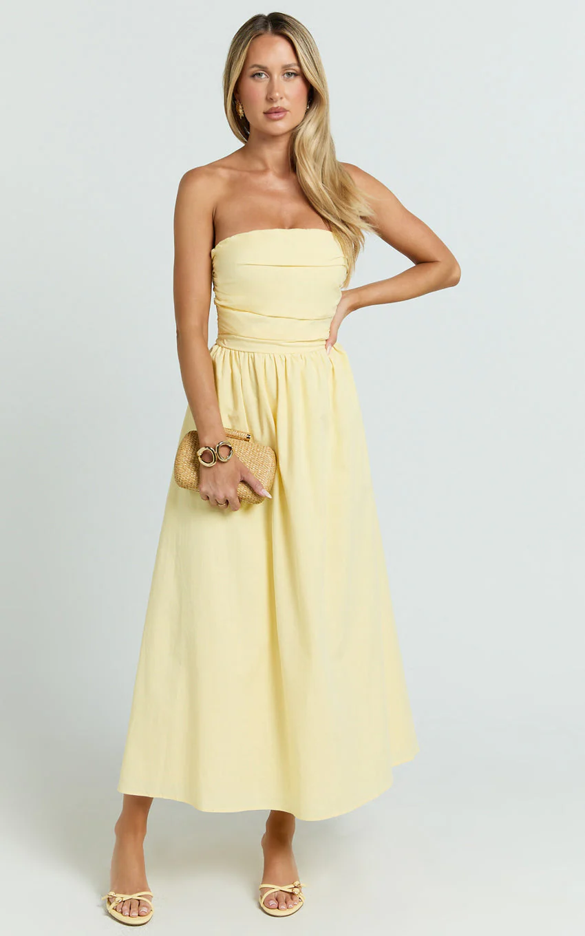 Polly Midi Dress - Strapless Ruched Dress in Lemon