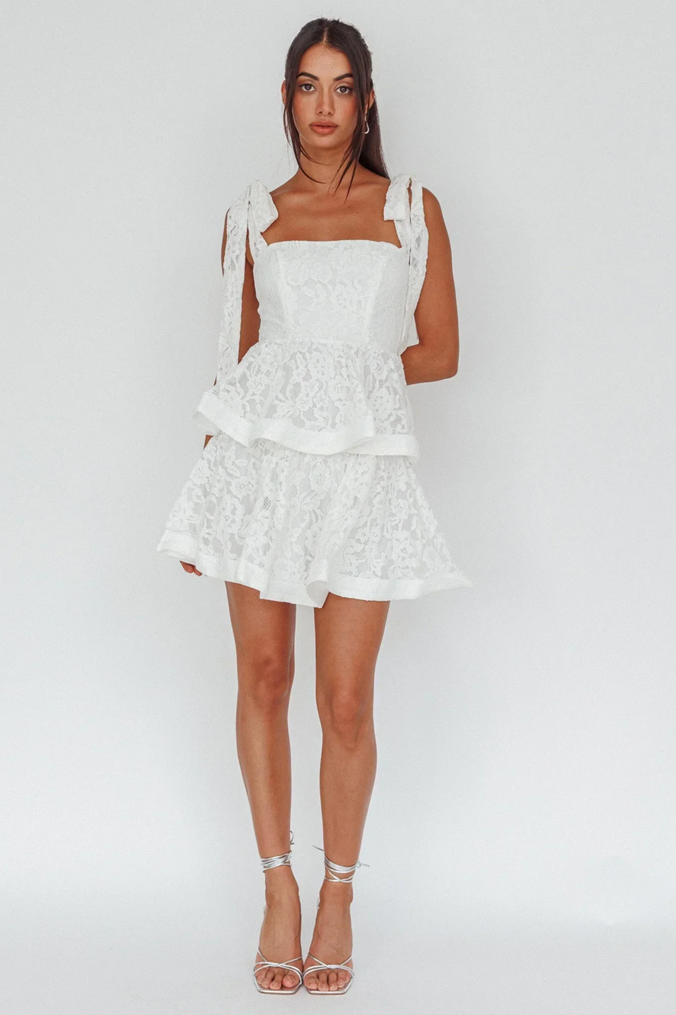 Neriah Tied Shoulder Tiered Lace Mini Dress White