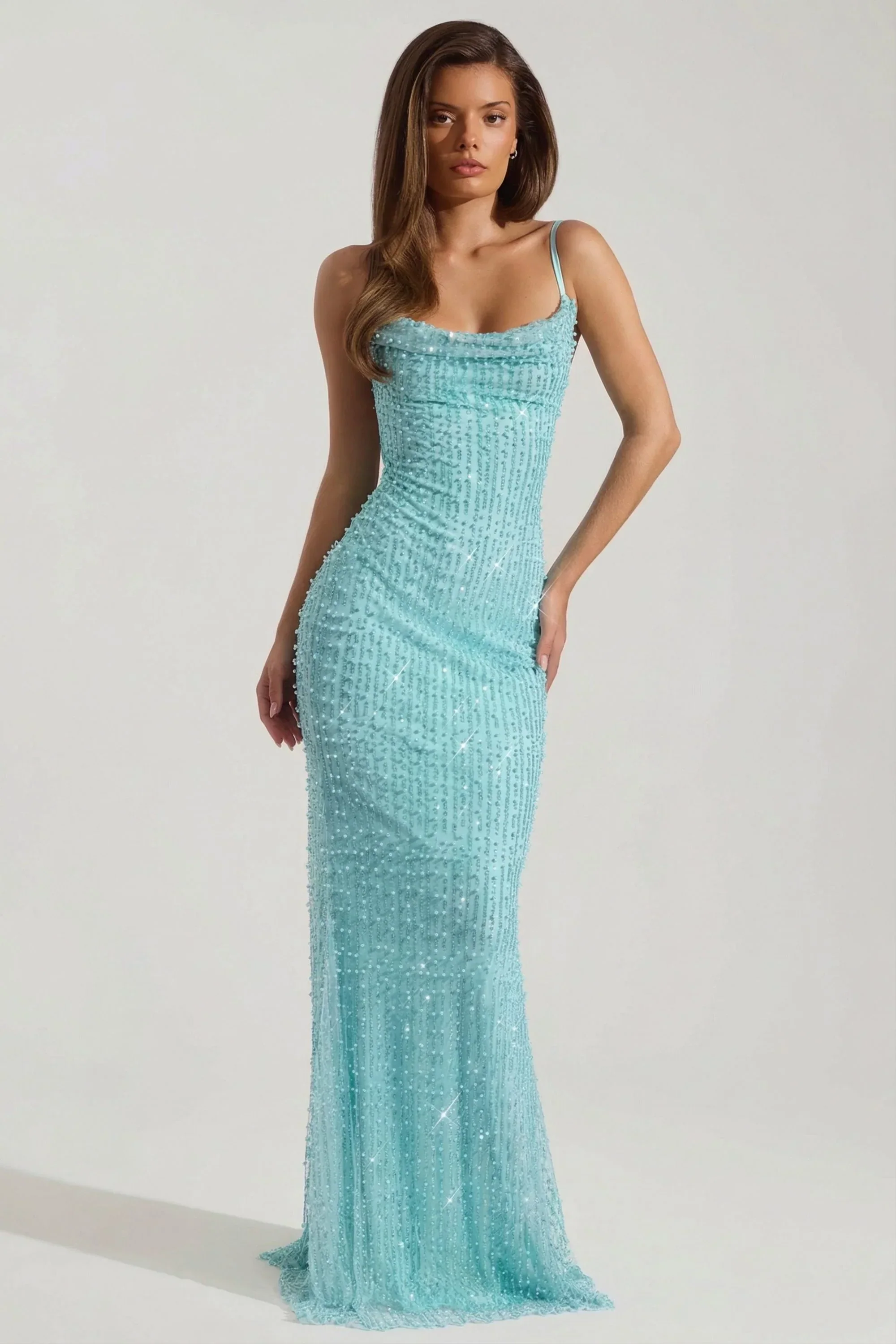 Embellished Cowl-Neck Backless Maxi Dress in Aqua Blue